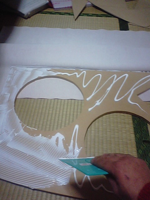 一面貼ってしっかり乾かして、角を折り曲げて次の面を貼って・・・と、焦らず時間をかけてやると初心者でも失敗しにくい。予定通りいかずに変更しないといけないところも出てくるしね。